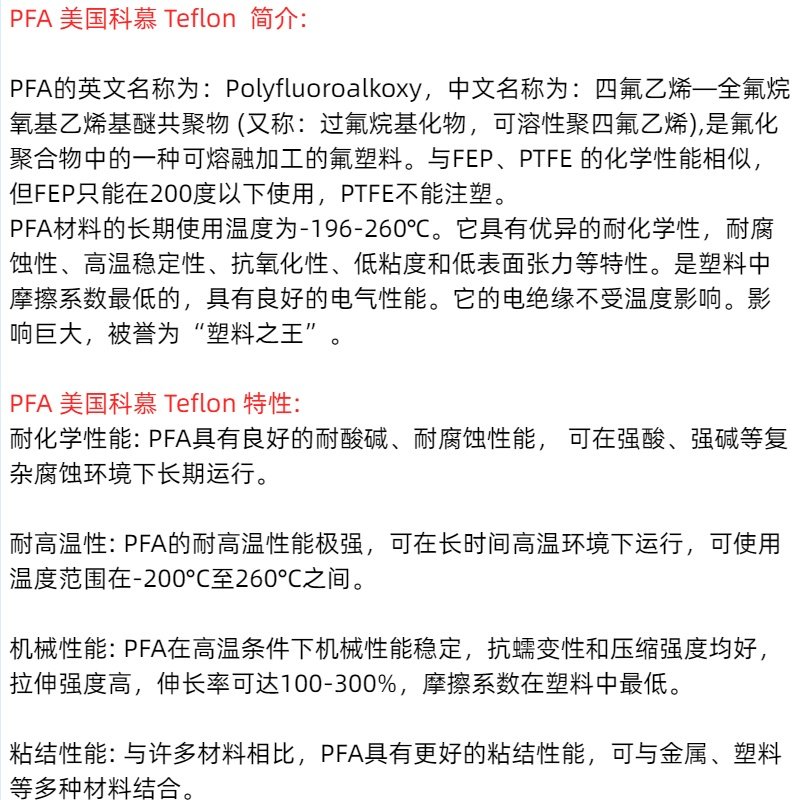 经过适当处理的由纯Teflon® PFA 345树脂制成的产品具有氟塑料树脂的优越性能:化学惰性、 的介电性能、耐热性、韧性和柔韧性、低摩擦系数、不粘特性、几乎不吸水、低可燃性、在 温度下的性能以及出色的耐候性。