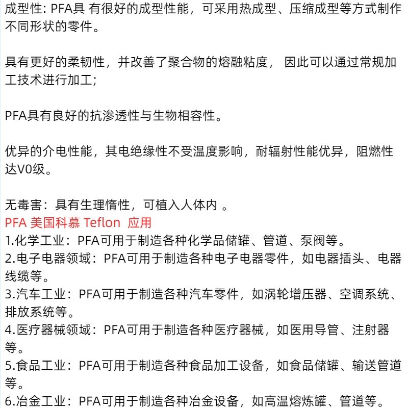 Teflon ® PFA 345 用于需要传统挤出和模塑工艺来生产具有氟塑料树脂 性能的产品。与其他热塑性塑料相比,Teflon ® PFA 345 的高熔体强度和热稳定性可以用来提高加工速度。与其他氟塑料相比,其在高使用温度下的蠕变抗性提供了更优的平衡和使用性能水平。Teflon ® PFA 345 结合了传统热塑性塑料的加工便利性以及许多类似于聚四氟乙烯的性能。